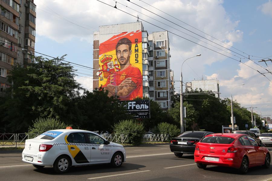 Базой испанской команды на этом чемпионате был Краснодар. В городе тщательно готовились к приему футболистов — даже украсили стены нескольких девятиэтажек портретами известных игроков. В том числе со стены одного из зданий на горожан теперь смотрит капитан испанской сборной Серхио Рамос: