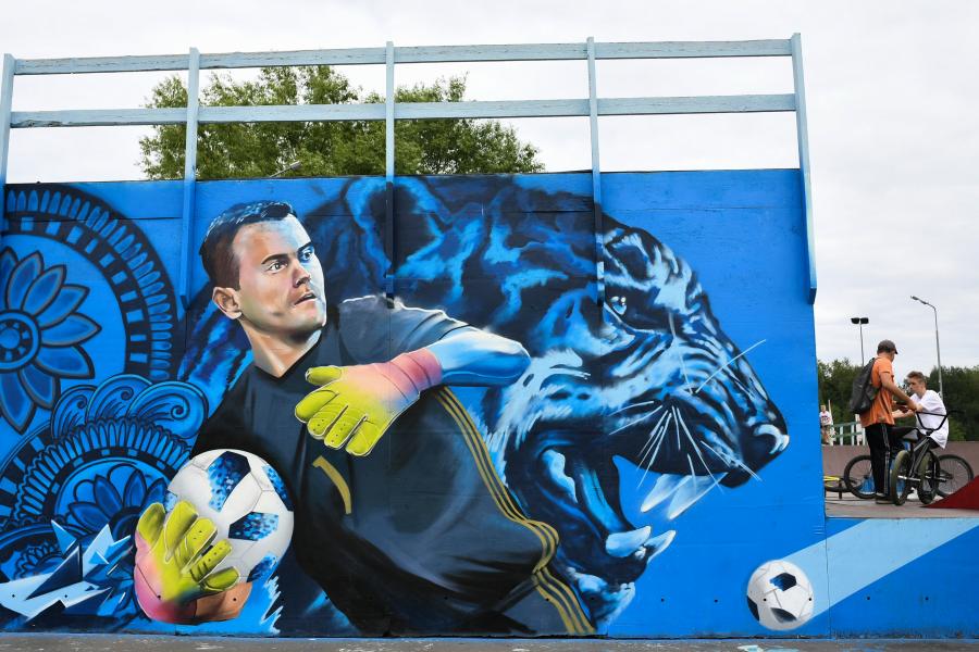 Почти одновременно с изображением поклонников хот-догов в другом подмосковном городе, Щелково, появилось граффити с капитаном российской сборной Игорем Акинфеевым. После сенсационной победы над командой Испании его признали лучшим игроком матча 1/8 финала: