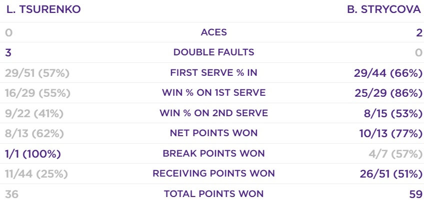 Нельзя сказать, что Цуренко поначалу играла ужасно, совсем нет. Иногда у нее даже кое-что получалось. Уровень был, конечно, ниже среднего, но все же главной причиной такого разгромного счета стала феноменальная игра Стрыцовой. Сегодня она была чудо как хороша практически во всех компонентах. В первом сете Леся смогла выиграть всего 3 розыгрыша на подаче соперницы, а впервые заработала брейкпоинт только в восьмом гейме второго сета. Это при том, что в седьмом у Стрыцовой уже был матчбол.
