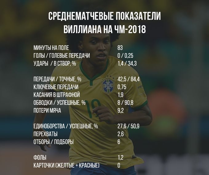 Кроме того, если на групповой стадии Виллиан вступал в единоборства, так сказать, от случая к случаю, то в важнейшем матче стадии плей-офф против Мексики футболиста «Челси» было невозможно увидеть не пытающимся навязать борьбу каждому находившемуся возле него оппоненту. Посмотрим на цифры: против Швейцарии Виллиан поучаствовал в 21 единоборстве (29% выиграл), против Коста-Рики - в 17 (53% выиграл), против Сербии - в 23 (35% выиграл), а вот против Мексики уже в 37, 70% из которых оказались для бразильца удачными.