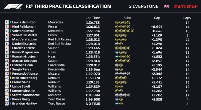 Что касается результатов, то лучшее время показал пилот Мерседеса Льюис Хэмилтон. В его темпе смог удержаться только Кими Райкконен, отставший на 0,093 секунды.
