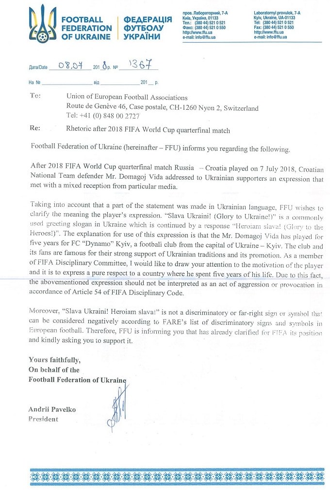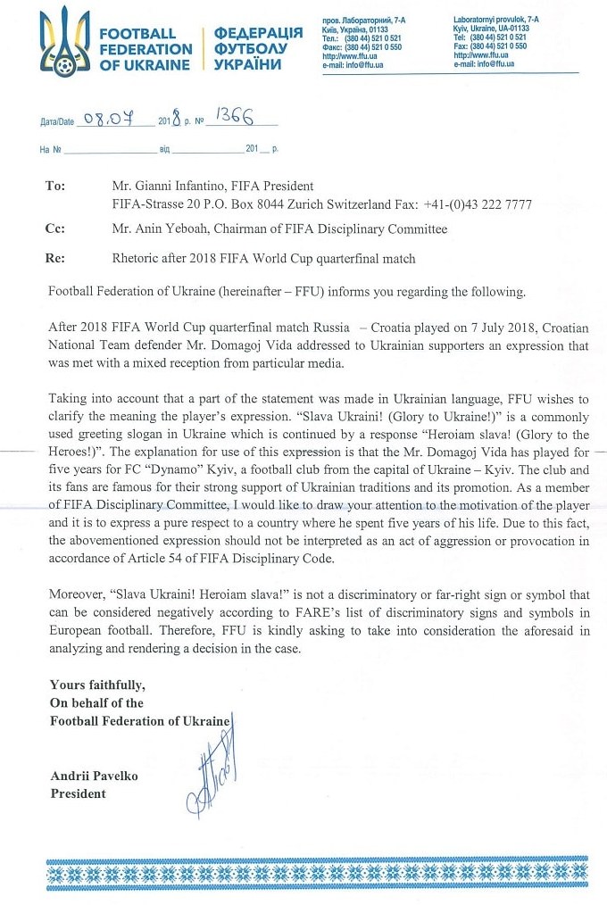 Зважаючи на це, Федерація футболу України та її президент Андрій Павелко вважали за необхідне підтримати Домагоя Віду та оперативно направили звернення до ФІФА з відповідним поясненням щодо гасла «Слава Україні!», а також до УЄФА з проханням підтримати позицію ФФУ у ФІФА. На численні прохання журналістів та вболівальників додаємо копію цих звернень.