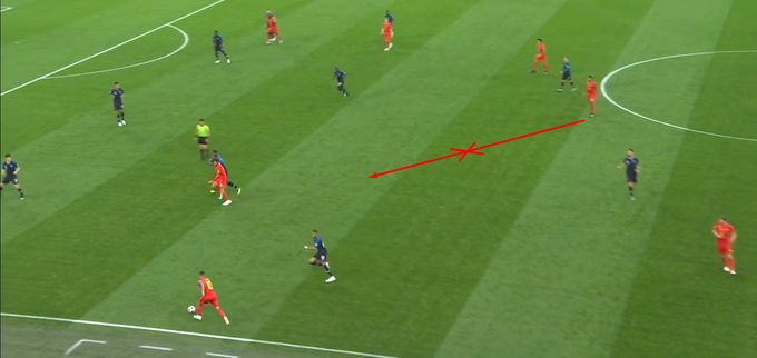 Начнем с позиционной работы при наступлении Бельгии. Мусса, в отличие от того же Витселя, пребывал в статике, преимущественно вообще не предлагая себя для передачи, несмотря на наличие свободных зон. На втором скриншоте, например, от Дембеле требовалось сделать полтора-два шага вперед и запросить пас, но он не предпринял и этого.