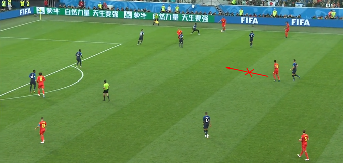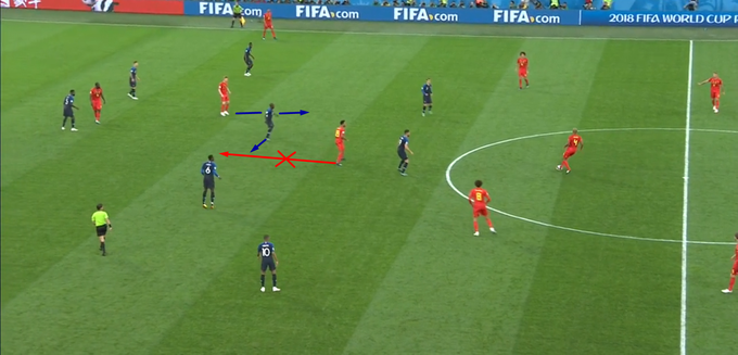 Еще один интересный момент представляли собой передвижения Маруана Феллаини. Опять-таки, необходимо поделить его роли на оборонительные и атакующие периоды: в первом случае Феллаини работал в опорной зоне вместе с Муссой Дембеле и Алексом Витселем, а во втором – уходил в пару к Ромелу Лукаку, загружая чужую штрафную площадь или просто опуская оборону Франции (два форварда Феллаини и Лукаку, высокое расположение Шадли, свободная роль Эдена Азара, наличие также Кевина Де Брейне – Франции приходилось обороняться весьма низко против такого соперника, включая прессинг только на своей половине поле).
