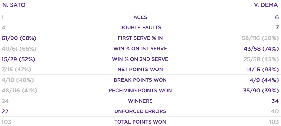 Отметим, что во втором сете Дема отыграла два матчбола японки на своей подаче и выиграла три гейма подряд.