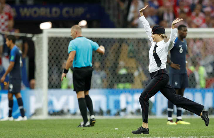 Во время финального матча чемпионата мира по футболу между Францией и Хорватией на поле выбежали четыре болельщика, переодетые в форму, похожую на милицейскую.