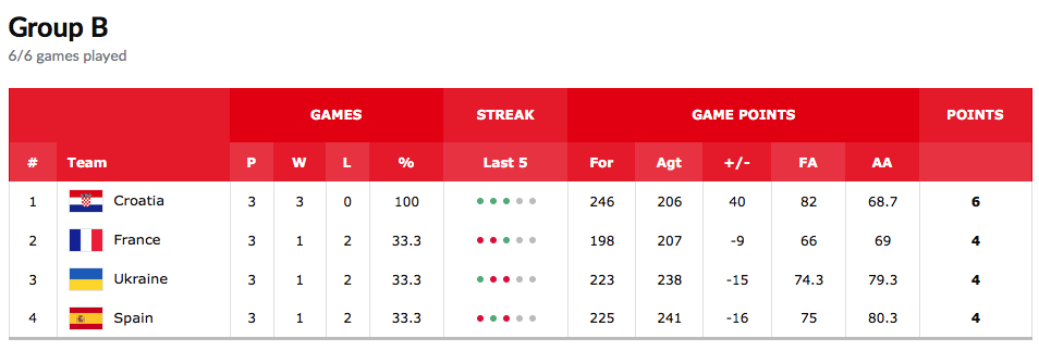 Підопічні Вадима Пудзрея у третьому турі поступились Франції, а збірна Хорватії перемогла Іспанію (85:70), тож Хорватія, вигравши усі три матчі, стала першою, Франція за рахунок кращої різниці в особистих зустрічах посіла друге місце, Україна - третє, а Іспанія, відповідно, стала четвертою.