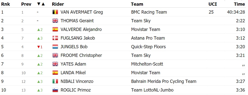 Единственный в этом году этап с финишем в подъем 1-й категории не повлиял на смену лидера. Грег ван Авермает сохранил желтую майку.