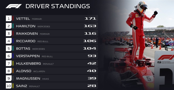 Победа на Сильверстоуне позволила Себастьяну Феттелю укрепить лидерство, которое, впрочем, остается символическим - лишь 8 очков перевеса над Льюисом Хэмилтоном. Постоянные неудачи Валттери Боттаса и частные сходы пилотов Ред Булл пока позволяют удерживаться в тройке Кими Райкконену, который всеми силами надеется доказать, что еще может принести Феррари пользу в 2019 году.