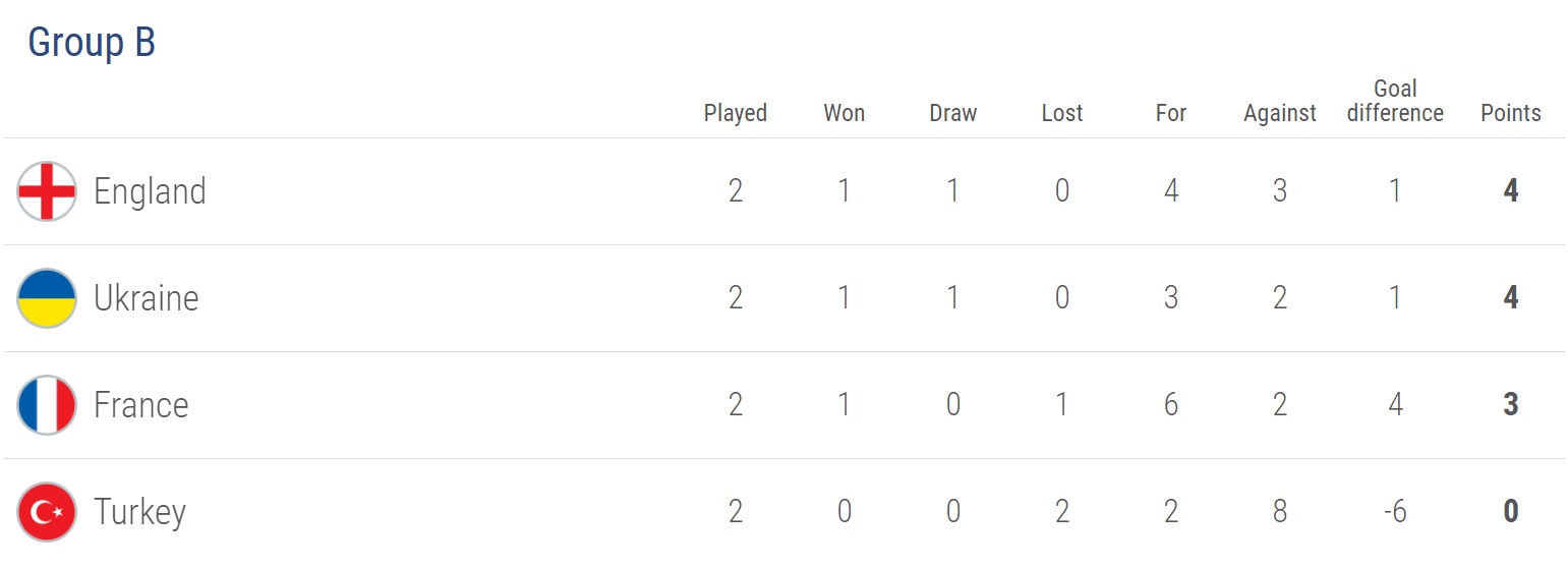 - Поражение Украины (5,5) также может вывести украинцев в плей-офф, но лишь со второго места. Для этого нужна или победа Англии (3,2), или ее поражение (2,15 - здесь снова буду считать дополнительные показатели с британцами). При ничьей в параллельном матче (3,9) украинцы будут выше французов за счет победы в личной встрече.