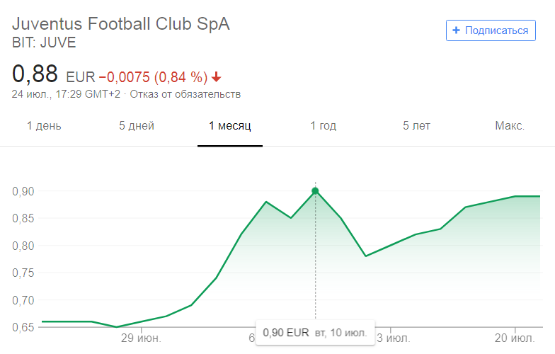 Своего пика ценные бумаги «Ювентуса» достигли 10 июля, когда о переходе Роналду было объявлено официально. В этот день акции туринцев торговались из расчета 0,9 евро за одну штуку.