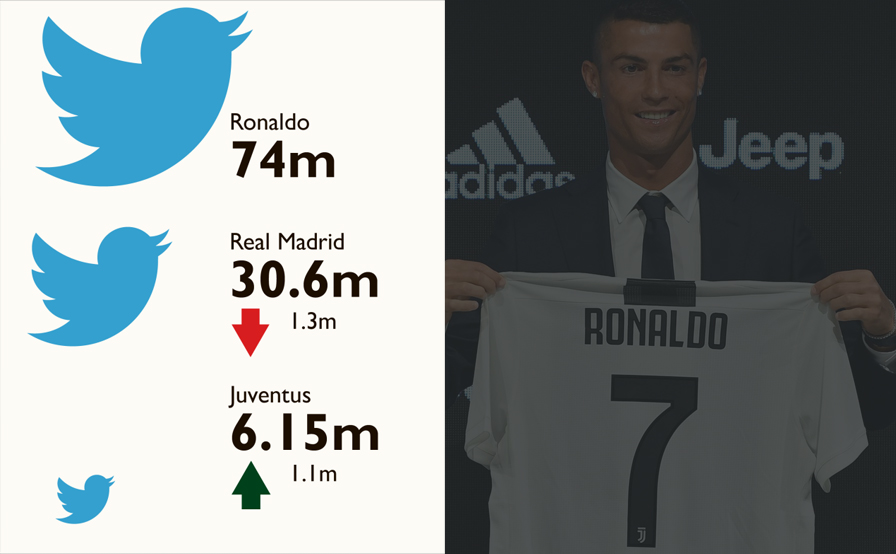 Подобная популярность Роналду не могла не сказаться и на «Ювентусе». По данным Football Benchmark, неделя трансферных слухов о скором переезде португальской звезды в Турин принесла итальянскому клубу 400 тысяч новых подписчиков в Twitter. Подобная картина наблюдалась и в социальной сети Facebook.