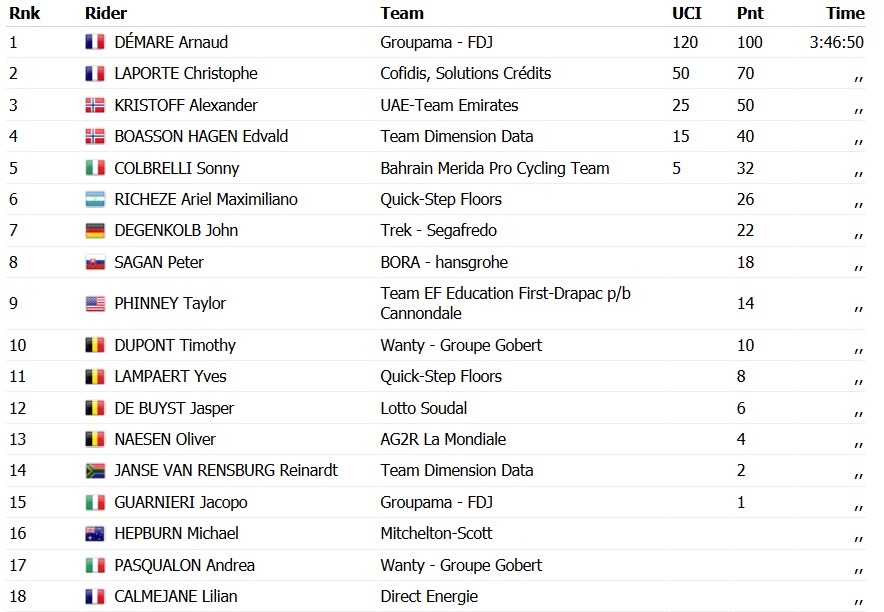 В ней сильнейшим оказался Арно Демар, который опередил своего соотечественника Кристофа Лапорта. Для Демара это первая победа на нынешнем Туре.