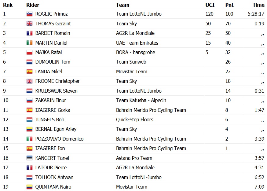 Последний горный этап Тур де Франс-2018 (200 км между Лурдом и Ларуном) завершился победой Приможа Роглича. Этот успех позволил 28-летнему словенцу подняться в топ-3 общего зачета: