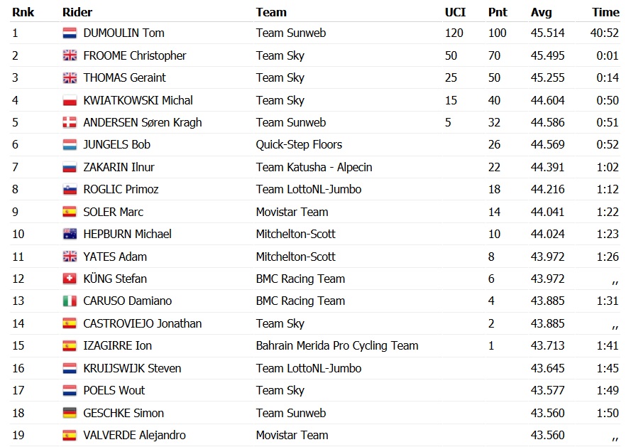 20-м этапом Тур де Франс была пересеченная индивидуальная разделка на 31 км. Ее победителем стал Том Дюмулен, который удержал второе место в общем зачете.