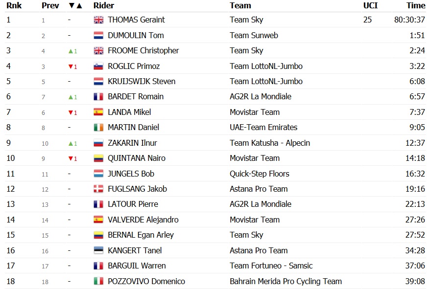 Герэйнт Томас сегодняшнем этапе финишировал только третьим, уступив 14 секунд Дюмулену и 13 – партнеру по «Sky» Крису Фруму. Этого британцу хватило для того, чтобы обеспечить победу на Туре-2018 перед заключительным «этапом дружбы» в Париже.
