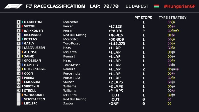 На время гонки Гран-при Венгрии дождь не прогнозировали, поэтому все самое интересное могло пройти на старте, но не произошло. Льюис Хэмилтон и Валттери Боттас сохранили свои 1-2 позиции, а Себастьян Феттель прошел Кими Райкконена и утвердился на третьей позиции. При этом Мерседесы стартовали на шинах ультрасофт, тогда как Феттель был на софте.