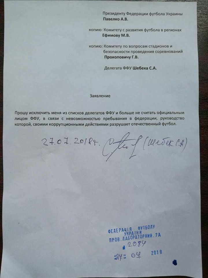 «Прошу исключить меня из списков делегатов ФФУ и больше не считать официальным лицом ФФУ, в связи с невозможностью пребывания в федерации, руководство которой своими коррупционными действиями разрушает отечественный футбол», – сказано в заявлении.