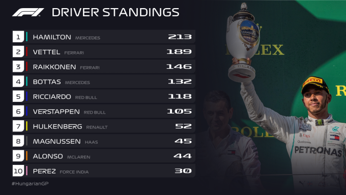Льюис Хэмилтон после не лучшего домашнего Гран-при Великобритании добыл победы в Германии и Венгрии, что позволило пилоту прочно закрепиться на первом месте в общем зачете. Пилот Мерседеса опережает Себастьяна Феттеля уже на 24 очка, и это почти запас в одну победу. Кроме того, это самый большой разрыв между соперниками в течение сезона. Теперь Хэмилтон может в трех следующих этапах приезжать вторым при победах Феттеля и все равно останется лидером.