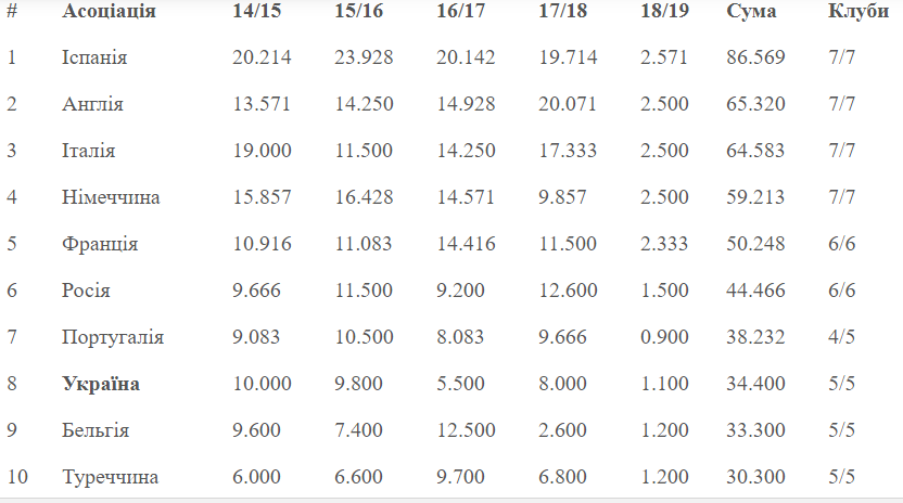Добавим, что «Шахтер» уже имеет четыре очка за участие в групповом этапе Лиги чемпионов, а «Динамо», «Заря» и «Ворскла» стартуют в еврокубках позже. Итак, в активе Украины пока 5,5 очка или 1,1 балла.