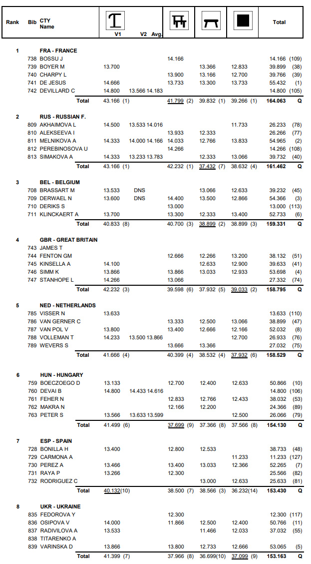 В итоге наши девушки набрали сумму 153,163. Полные результаты квалификации команд: