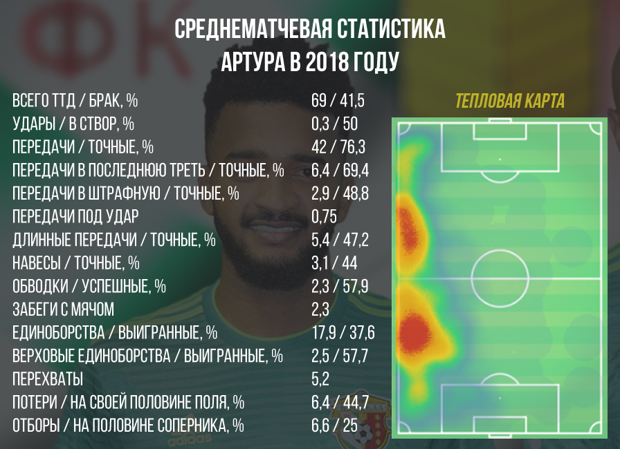 Артур хорошо вписывается в командую игру. Он привык часто открываться и видеть открывания коллег. Приличная часть его передач направлена на обострение ситуации. Это демонстрируют высокие показатели передач в последнюю треть поля (в среднем - 6,4 за матч) и в штрафную площадь соперника (2,9 за матч).