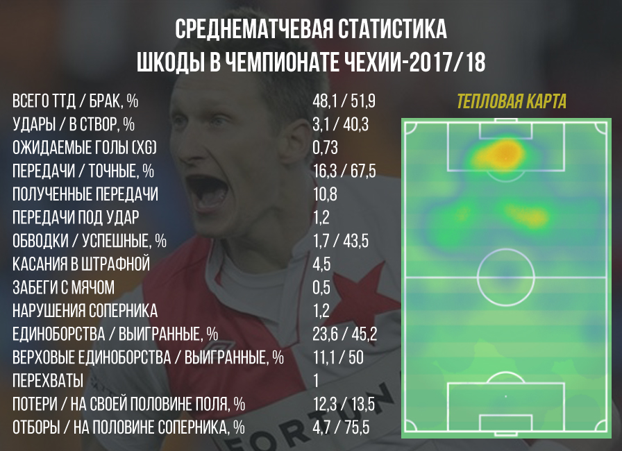 Чтобы лучше понять стиль игры Шкоды, достаточно взглянуть на его статистические среднематчевые показатели в минувшем сезоне чемпионата Чехии.