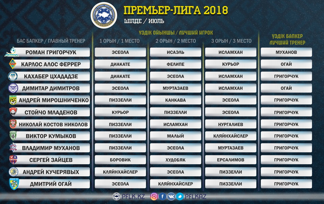 Лучшим тренером прошлого месяца назвали главного тренера «Астаны» Романа Григорчука. За него отдали 9 из 11 голосов. В июле «Астана» раз сыграла вничью и дважды выиграла по 2:0. Сейчас клуб занимает первое место в чемпионате Казахстана, опережая «Кайрат», у которого матч в запасе, на 6 очков.