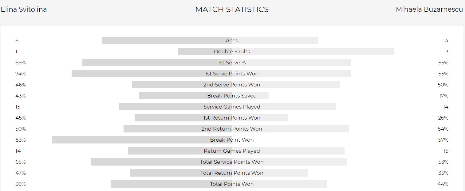 Старт первого сета выдался весьма странным. Бузарнеску была непохожа на себя и практически вчистую проиграла первые четыре гейма. Свитолина не делала ничего сверхъестественного, но этого оказалось достаточно, чтобы сделать столь весомый задел. Румынка напомнила о себе только в пятом гейме, вчистую выиграв подачу украинки. Это был первый тревожный звоночек. До конца сета Элина больше своих подач не проигрывала, что и позволило довести партию до победы.