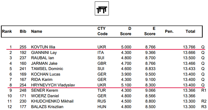 С первым результатом в квалификации на брусьях выступил Илья Ковтун. Восьмерку финалистов замыкает Владислав Гриневич. К слову, на брусьях наши гимнасты набрали лучшую сумму среди всех команд в квалификации.