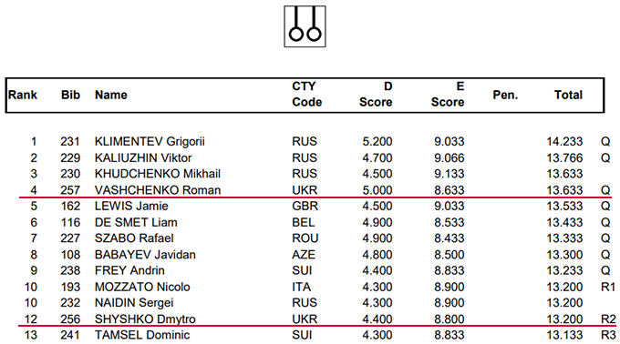 Уверенную работу на кольцах продемонстрировал Роман Ващенко, у него есть шансы побороться за медали в финале. Дмитрий Шишко стал вторым запасным.