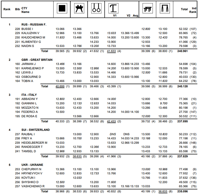 Наши гимнасты достойно выступили в квалификации. В командном зачете они заняли итоговое 5-е место с суммой 235,096. Первое место у сборной России – 240,961. Второе место заняли гимнасты из Великобритании – 240,128. Бронзовыми призерами стали юниоры из Италии с суммой 237,895.