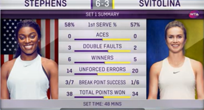 Старт поединка остался за действующей чемпионкой US Open. Стивенс играла мощно, надежно и практически без ошибок. Атакующая манера игры Свитолиной потребовала от нее несколько геймов пристрелки, которые пошли в копилку соперницы. Американка повела 4:0 и, в отличие от Мертенс в 1/4 финала, такое преимущество отдавать не собиралась. Элина пробовала гонять соперницу по корту с последующими выходами к сетке, иногда это получалось очень даже эффектно (в определенный момент и эффективно – 8 из 9 выходов были удачными). Также было отчетливо заметно, что украинка вкладывается в каждый удар, в то время как американка играла далеко не на пределе. Учитывая преимущество во всех силовых компонентах, делать ей это было не так и сложно.