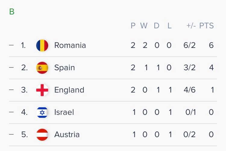 У групі В є одноосібний лідер - це кількаразовий чемпіон Європи, збірна Румунії. Поки що у наших сусідів дві перемоги із комфортними рахунками та перевагою у два м'ячі у кожному матчі - 2:0 проти Австрії та 4:2 з Англією. В іспанців - перемога проти Ізраїлю (1:0) та нічия з англійцями (2:2). Саме Іспанія та Румунія наразі очолюють групу.