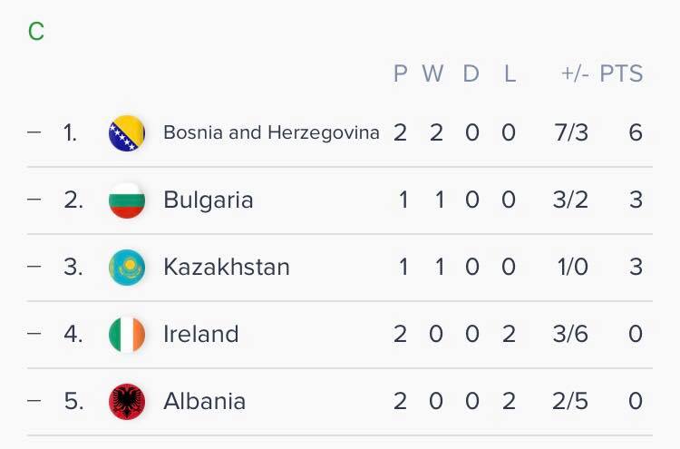 Услід за ними йде дві збірні: Болгарія та Казахстан - по одному зіграному матчу і по одній перемозі в них. Скоріше за все, саме казахи і болгари розіграють друге місце в групі. Адже явними аутсайдерами є ірландці та албанці: за два матчі жодна з цих збірних не набрали бодай залікого очка.