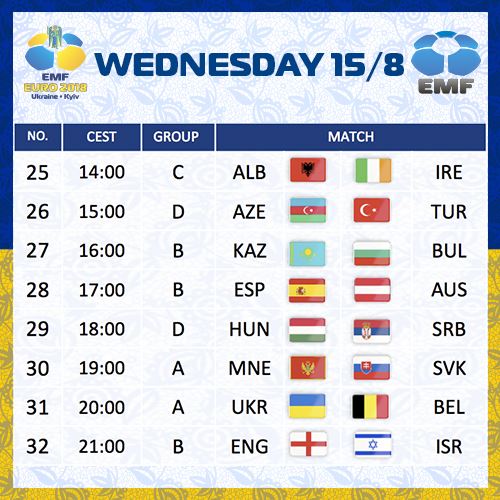 Повний розклад матчів четвертого дня міні-футбольного Євро-2018 нижче (час - європейський, +1 година для визначення київського часу).