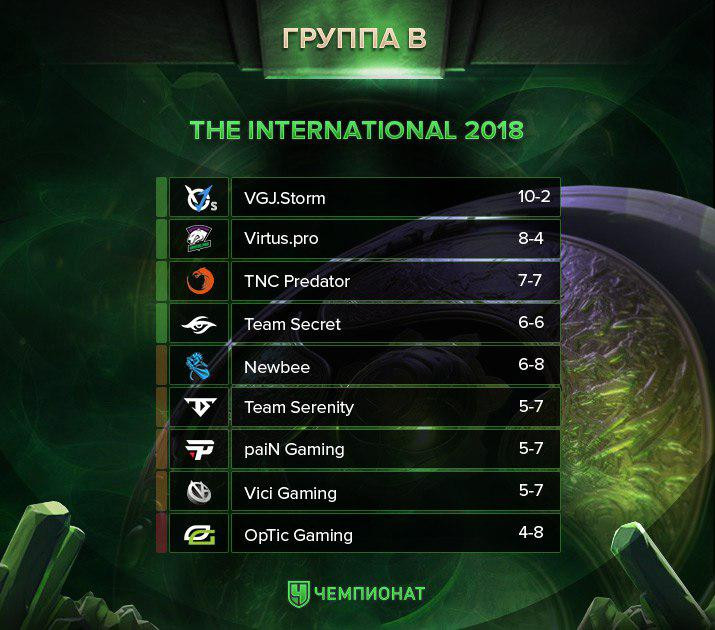 VGJ.Storm продолжает лидировать в группе B. Сейчас команда идет имеет в активе 10 побед и 2 поражения. Ближайший преследователь — Virtus.pro (8 побед, 4 поражения). Также в топ-4 находятся TNC Predator и Team Secret.