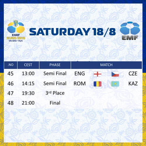Сьогодні, 18 серпня, завершується чемпіонат Європи з міні-футболу. Півфіналістами змагання за підсумками шостого ігрового дня стали збірні Чехії, Румунії, Англії та Казахстану. Збірна ж України у чвертьфіналі вилетіла від англійців, поступившись у серії пенальті - 1:3, після нічийного рахунку в основний час - 1:1.
