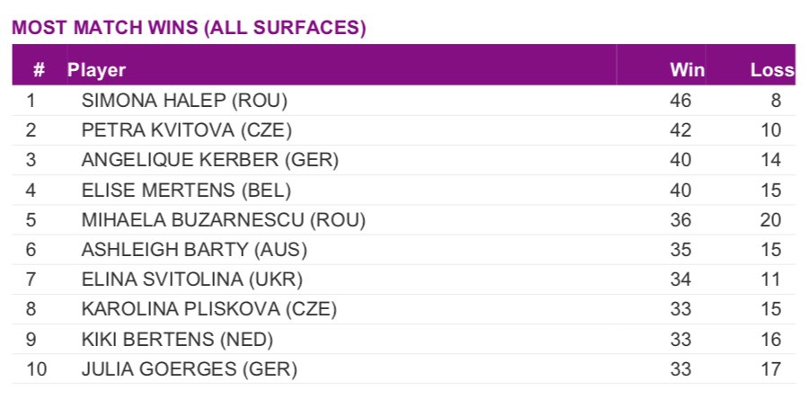 Что касается общего количества побед, то здесь Свитолина на седьмом месте (34 из 45). Лидирует все та же Халеп (46 из 54). Отметку в 40 побед в сезоне на данный момент кроме румынки преодолели Петра Квитова (42), Анжелик Кербер и Элизе Мертенс (по 40). Отметим Михаэлу Бузарнеску, которая расположилась на пятой позиции с 36 победами в 56 матчах.