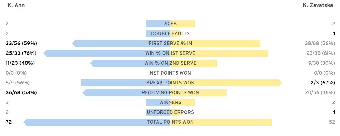 По разу в каждой партии украинке удалось взять подачу соперницы, но свою Катарина не удержала дважды в первом сете и трижды – во втором. Американка играла стабильнее, зарабатывала больше очков и ее победа читалась где-то в середине первой партии. К счастью, Завацкая не опустила руки и играла до последнего, хотя и особой выгоды это ей не принесло.