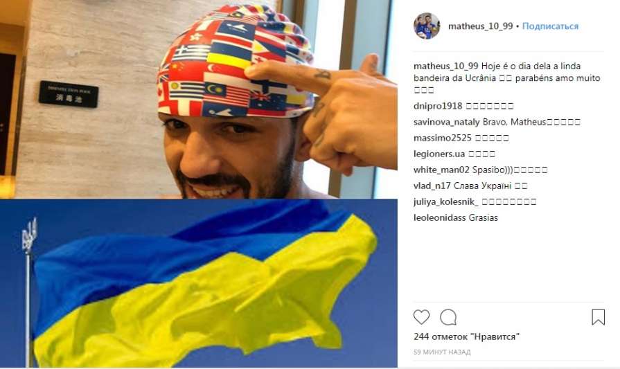 Колишній півзахисник «Дніпра» Матеус виклав у соціальній мережі фото з прапором України. Таким чином 35-річний футболіст привітав українців з Днем Державного прапору.