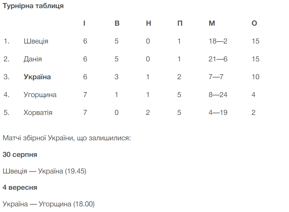 Нагадаємо, українська команда після шести зіграних матчів має у своєму активі десять залікових пунктів та посідає третю сходинку у кваліфікаційній групі. Шведки ж очолюють нашу групу, випереджаючи жовто-синіх на п'ять очок.