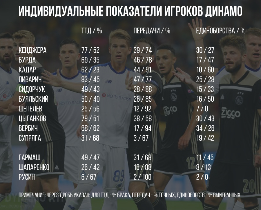 Довольно красноречивой является ключевая индивидуальная статистика футболистов «Динамо». Из полевых игроков выделить практически некого. Более менее неплохой футбол продемонстрировали Кенджера и Цыганков, но первый провалился в моменте с пенальти, который был «привезен» поляком в свои ворота фактически на ровном месте, а второй при в целом неплохой активности был крайне неэффективен в игре в пас - процент брака у Цыганкова во вторник вечером буквально зашкаливал.