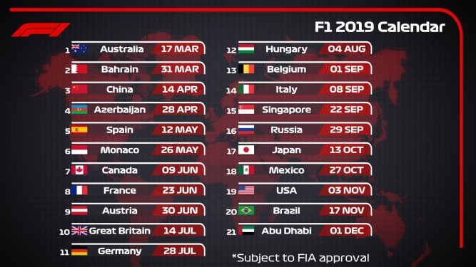 Ф-1 опубликовала предварительный календарь на сезон-2019. Позже его должна утвердить ФИА, однако в календаре остается 21 этап без изменений по странам проведения.