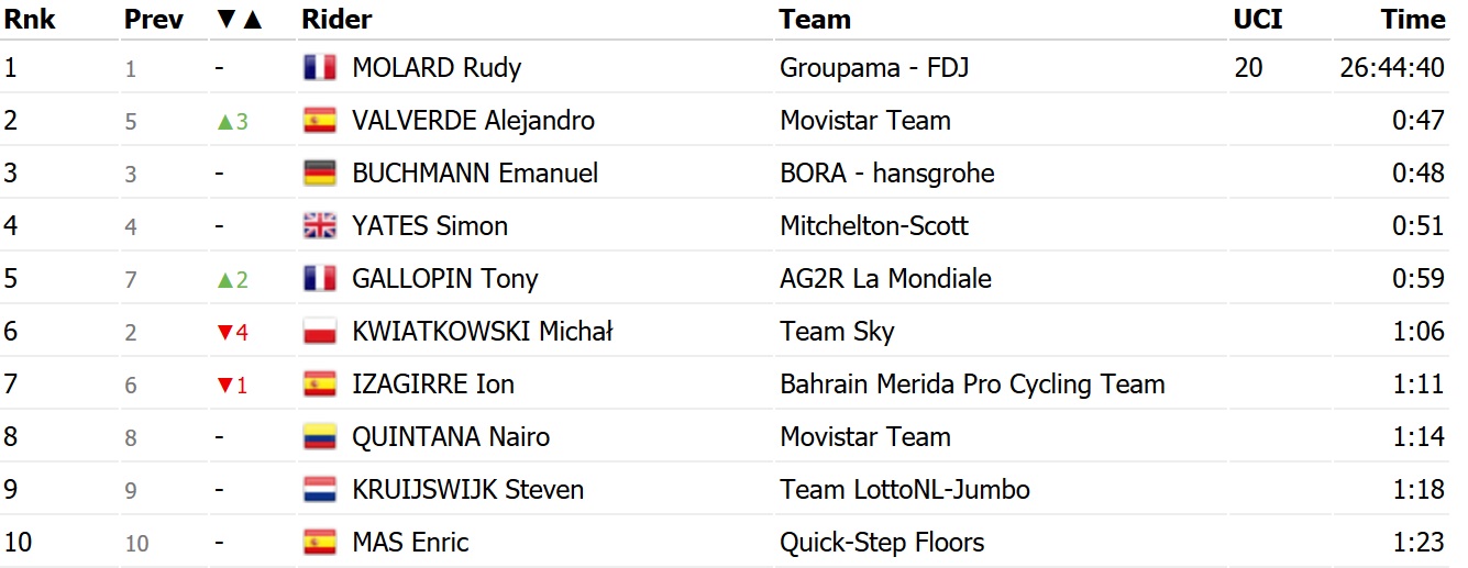 Из-за падения 30 секунд на этапе потерял вице-лидер общего зачета Михал Квятковски, из-за чего он опустился на 6-е место. Вторым теперь идет Алехандро Вальверде, а красную майку лидера сохранил француз Руди Молар.