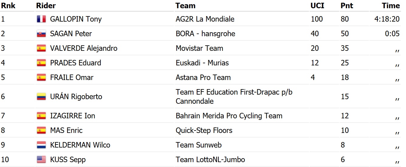 Поздняя атака за 2 км до финиша принесла французу Тони Галлопену победу на седьмом этапе Вуэльты. Спринт из пелотона за второе место выиграл чемпион мира Петер Саган, опередивший Алехандо Вальверде.