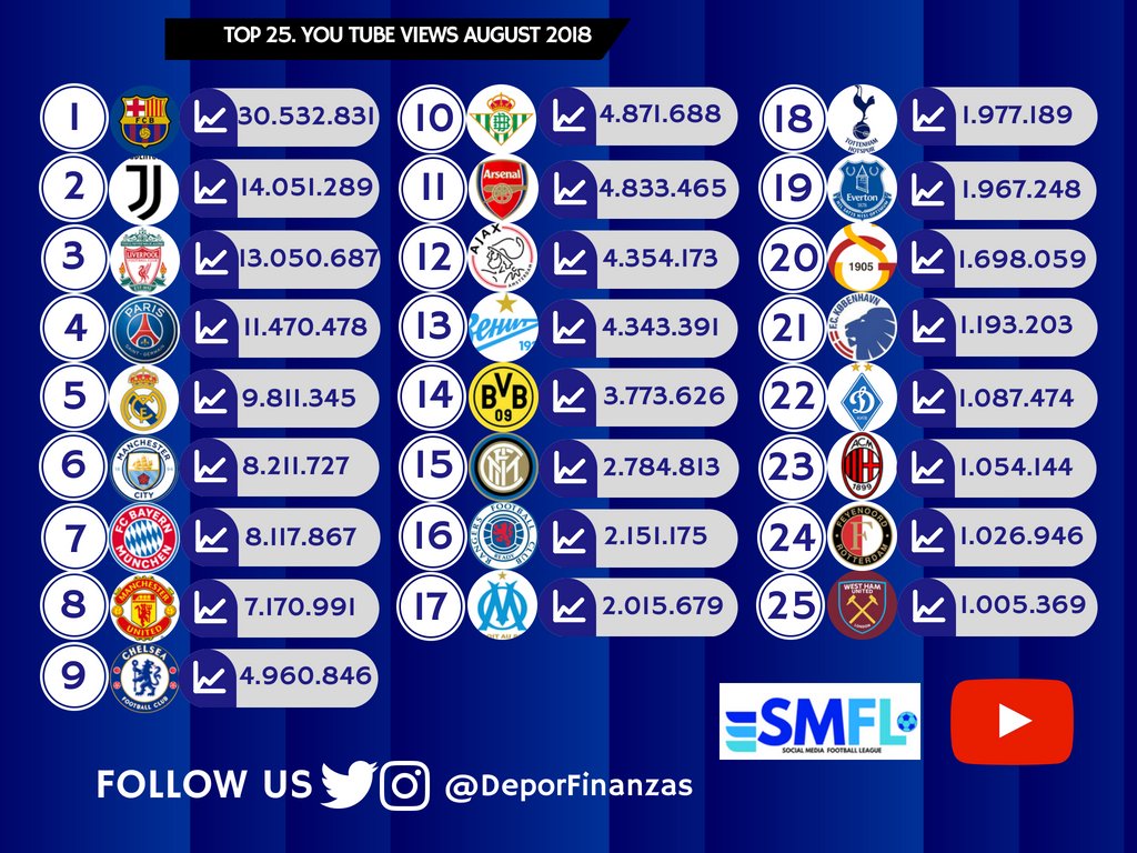 Для сравнения, у «Барселоны», которая является лидером среди европейских футбольных клубов, более 30 миллионов просмотров за август, у «Бетиса», который идет на 10-м месте – около пяти миллионов.