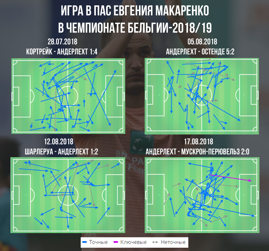 Карта его передач демонстрирует многогранность, которую придает Евгений игре «Андерлехта». Макаренко способен довольно успешно применять короткие, средние и длинные передачи, разворачивать атаки с одного фланга на другой, а также имеет неплохую статистику в единоборствах, хотя эти цифры у украинца пока пониже тех, которых он добивался в минувшем сезоне в стане «Кортрейка».