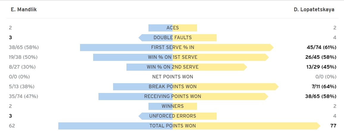 Матч длился 1 час, 28 минут. На счету Лопатецкой 2 эйса, 4 двойных ошибки. Также украинка реализовала 7 брейк-поинтов из 11-ти.