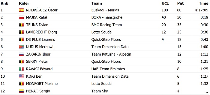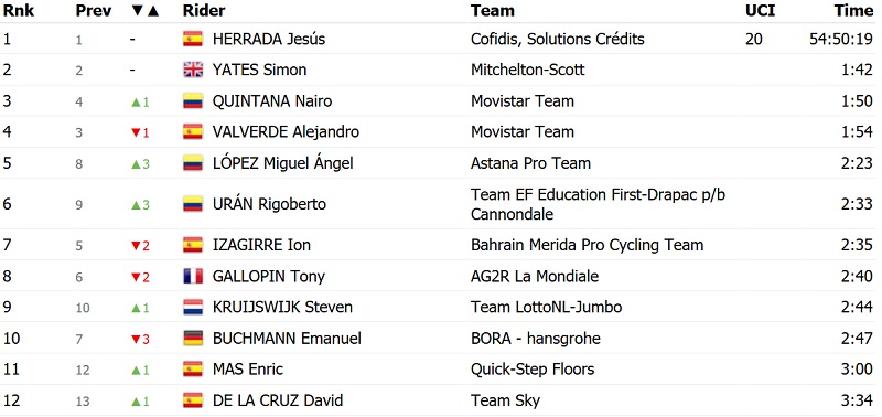 В общем зачете Хесус Эррада потерял значительную часть своего преимущества, но все же сохранил красную майку лидера. Его преследуют Саймон Йейтс и Найро Кинтана, которые сегодня оказались сильнейшими из пелотона.